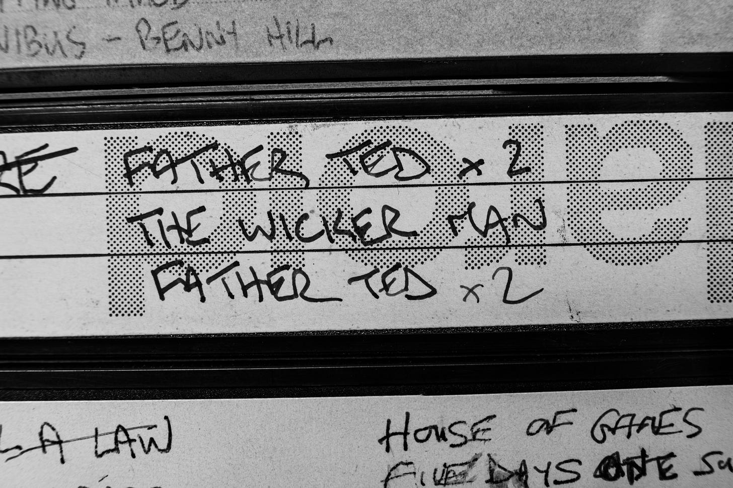 So, the photos are taken and the catalogue created, but for now, the tapes need to go back on the shelves. I can’t even weed out the 50% that could be thrown out because of the sometimes hilarious juxtaposition of massively contrasting shows and films, recorded on the same tape.